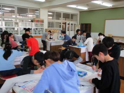家庭科の授業で,ナップサック作りが始まりました。誰もが真剣そのもので,家庭科室に響くのはチャコペンを動かすかすかな音だけです。時折,互いに教え合うひそひそした声も混じります。そんな子どもの姿を担任が静かに見守ります。