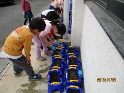 生活の学習で朝顔の種を植えました。自分の鉢に土と肥料を入れ,指で穴を作ってそっと種を中に入れました。そのあと土のお布団をかけて,水やりをしました。みんなとてもやさしく丁寧に作業をしていました。これからしっかりとお世話をしてあげて,どのように成長していくのかとても楽しみです。