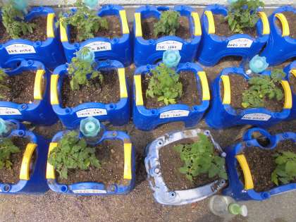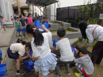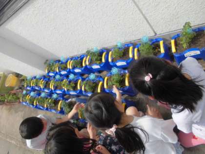 トマトの苗を植えました。チューリップが植わっていた鉢をひっくり返して植えました。野菜はお水がとっても好きなので,水やりをしっかりしてたくさんミニトマトができたらいいね。