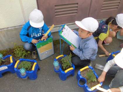 ミニトマトの観察をしました。高さ・触った感じ・色・形など詳しく観察しました。30センチものさしをつかって高さを計りました。