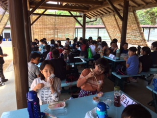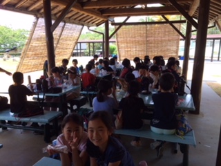 東屋でおうちの方に作っていただいたおにぎりをほおばっています。日差しが強いので,先生は早速,補充用のお茶を沸かしました。予定を変更して,午後からは磯観察に行きます。熱中症には十分気を付けます。