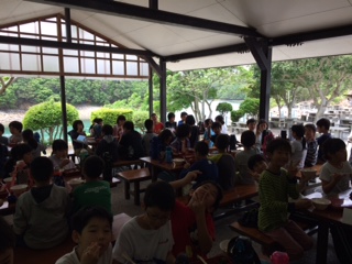 昼食は炊事場で,お弁当を食べています。おかげ様でまだ雨も降ってきていません。