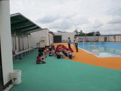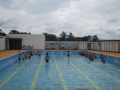 ちょっと肌寒い日になりましたが,規定の気温・水温に達していましたのでプール開きをしました。1年生はプールに入る順番等を習いました。安全な水泳指導体制をとり,更に職員しつでもカメラ映像で指導の様子を見られるようになっています。