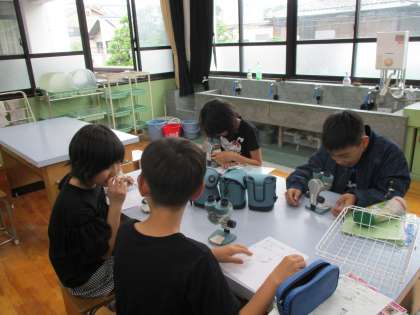 理科の「メダカのたんじょう」の学習では,学校の池に住んでいるメダカを観察しています。たまごを顕微鏡を使って見ると,目のようなものがあったり,心臓が動いているところが見えたりしました。