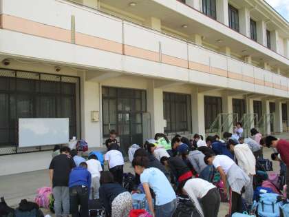 出発式では,元気のよい挨拶をさっそく校長先生からほめられ,うれしそうにしていました。