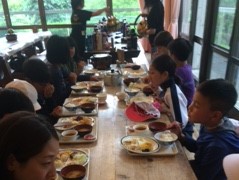 登山でお腹が空いたのか、食堂でのバイキング夕食はお代わりする子がいっぱいいます。後は待ちに待ったキャンプファイヤーです。今日の様子のお知らせはこれで終わる予定です。