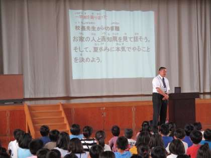 そして,最後に校長先生からの「夏休みに本気でやることを決めよう」という夏休みの宿題が出されました。各ご家庭で,お子さんとお話していただき,何か一つ本気で集中して取り組めることを一緒に考えていただければと思います。2学期の始業式でどんなことに取り組めたのかを聞かせてもらう予定です。