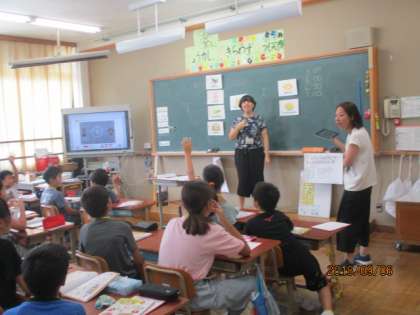 2学期になってALTの先生が来校される最初の日です。今日のは,「○○時に○○をします」との表現です。今から多くの表現を覚えられるといいですね。