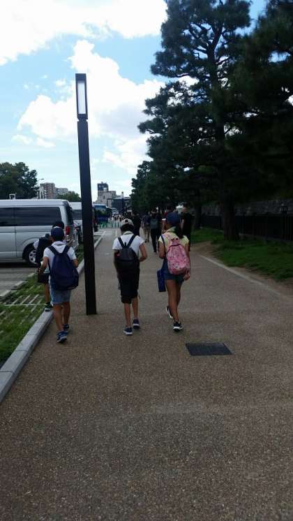 午前中の予定を終えて,昼食場所を兼ねた二条城に多くの班が集まり,お弁当を食べています。お腹がいっぱいになった班から,午後の訪問場所に出かけます。
