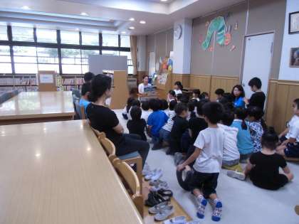 今日,図書館ボランティアのぽぽんたさんが読み聞かせに来てくださり,防災関連の紙芝居を読んでくださいました。たくさんの子どもたちが,真剣にきいていました。図書館の掲示物も秋にかわり,図書館に秋がきました。
