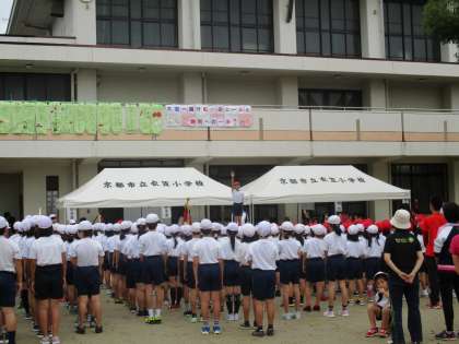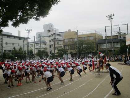 準備運動では,係の子が前に出てきて,全校みんなで元気に体を動かしました。