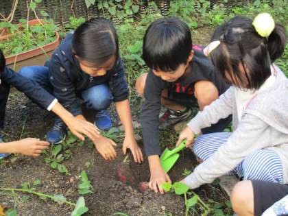 お芋ほりをしました。今年は数か少なかったのですが,形の良いものが多かったです。掘った後は,なかよしペアで見つけたよカードに絵をかいて記録しました。早く食べたいね。