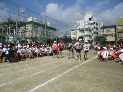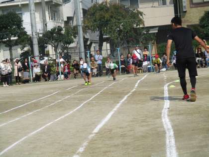 6人一チームでアンカーは150mを走ります。バトンをつなぐたびに順位が入れ替わり,最後まで勝負がわからない展開に,応援席で見ている子どもたちもドキドキでした。