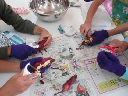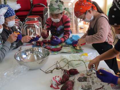 収穫して置いておいた,土のついたおいもを丁寧に洗い,ピーラーを使って皮をむきました。怪我をしないように,高坊先生の注意を守って,小さな手でしっかりとおいもをにぎっていました。明日はいよいよ1年生とのおいもパーティーです!