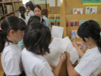 読書週間の取組みで,今日の中間休みに中学年がクイズラリーをしました。図書館の中でクイズを解いてまわり,最後にはお手製のしおりがもらえます。楽しそうに答えを考えていました。