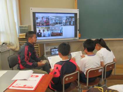 それぞれの学校でウェブカメラを使い,自校の取組みを発表し合いました。画面に映る互いの姿を見ながらの会議となりました。