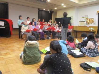 「つながる」をテーマに昔と今を、子どもと大人を繋ぐイベントが開催されました。先ずは地域の方から、昔の衣笠の様子について話をうかがいました。西大路通りに市電が走っていたり,プロ野球の球場があったりと、驚くことばかりでした。続いては,コーラスの皆さんの合唱が披露して下さり,その後は会場の皆さんで大合唱となりました。