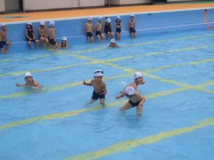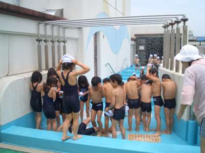 今日から水泳の学習が始まりました。1・2時間目には2年生が,3・4時間目には1年生とわかば学級の児童がプールで水遊びをしました。今日は最初なので,膝ぐらいの水位でカニさんになったり,ワニさんになったりしながら,水慣れをしました。少し肌寒かったですが,子どもたちはみんな今年初めてのプールを楽しんでいました。