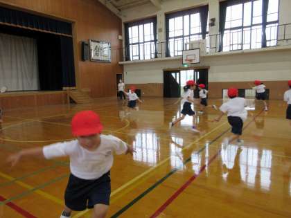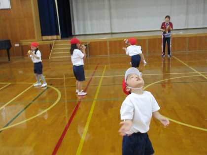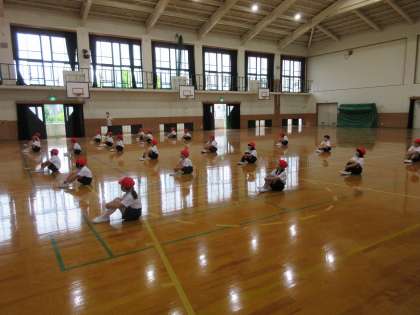 1年生はじめての体育では,体ほぐしの運動遊びをしました。はじめに,体育の時の座り方を確認した後,バッタにチョウになりきって動いたり,紙風船を地面に落ちないように打ち上げたりして遊びました。「30回以上打ち上げられたよ!!」と嬉しそうに教えてくれた子どもたちでした。