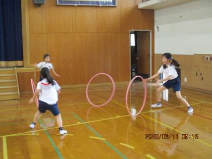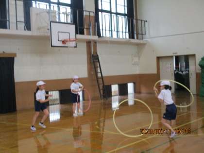 フラフープを使って,くぐったり回したり,自分たちで動かし方を考えて運動しました。