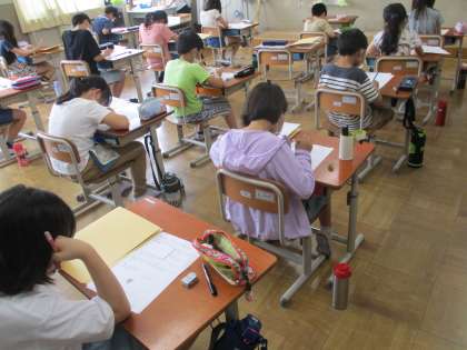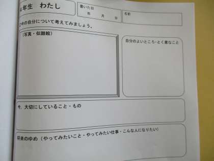 今日は4年生が“今のわたし”について自分と対話しながらプリントに書き込んでいました。