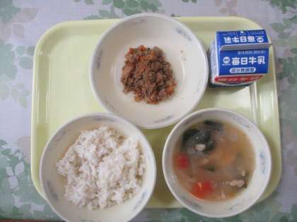 今日の献立は,麦ごはん,牛乳,おからさば丼(具),トマトだご汁でした。