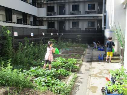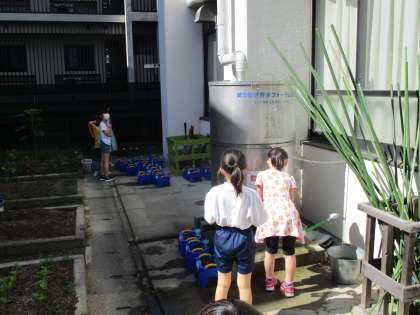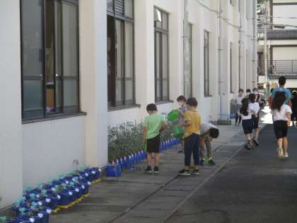 子どもたちは朝に登校してくると,自分のペットボトルやジョロに水をくみ,水やりをしにいきます。