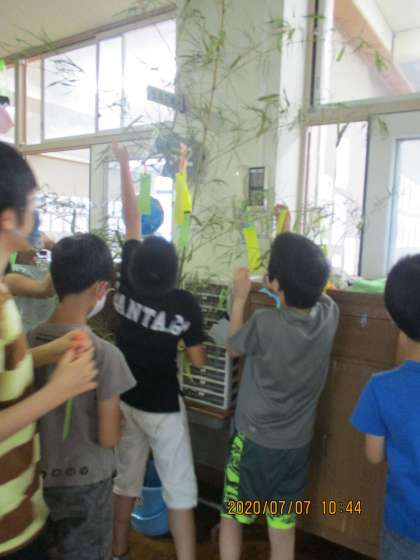 七夕飾りを作りました。5年生のみんなで願い事を書きました。それぞれが何になりたい。何がほしいと楽しい夢や希望が書かれていました。昨日の夜は雨でした。来年は晴れますように。