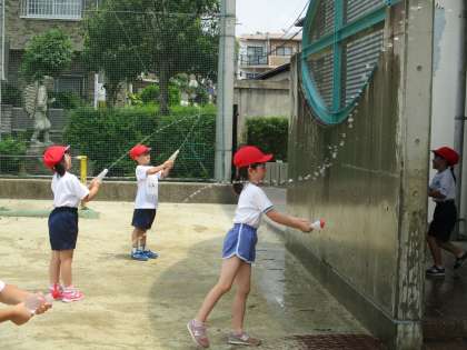生活科「なつだとびだそう」がやっとできました。久しぶりの晴れだったので,水遊びを体育の後にしました。運動場に絵をかいたり,塀越しに水を飛ばしあいっこしたりして楽しく遊びました。少し濡れましたが,夏の日差しにすぐ乾きました。次は図工科「すなやつちとなかよし」です。砂場で泥遊びです。楽しみですね。