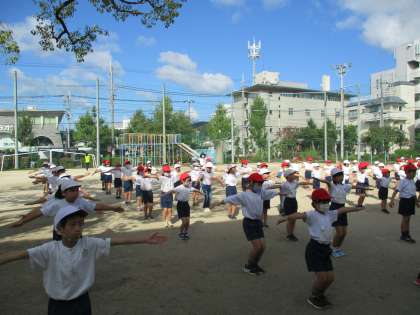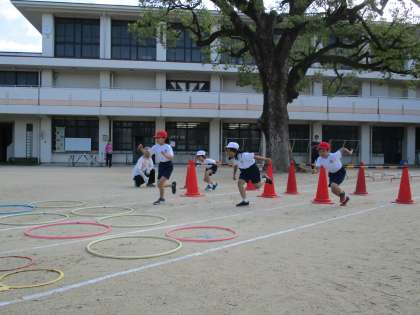 体育発表会のリハーサルをしました。今日は開会式から準備体操,50m走にアイディア走,また閉会式まで練習して,全体の流れについて確認しました。1年生にとってはすべてが初めてのことなので,ひとつひとつのことをゆっくりと確かめながら進めました。2年生はさすが昨年に運動会を経験しているだけあって,並んだり移動したりという行動がとても早く,1年生のよい見本になってくれました。競技では,まだ練習ながら力いっぱい走り,本番での白熱したレースを予感させてくれます。来週の発表会が楽しみです。