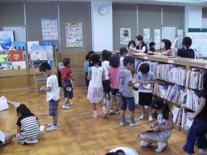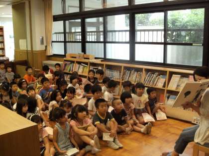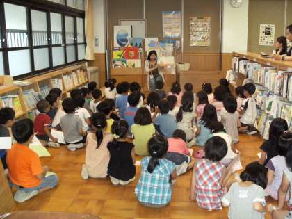 本校では,子どもたちが少しでも本に親しむように,また,図書室を多く利用してくれるようにと,図書ボランティア「ぽぽんた」の皆さんが活動してくださっています。今日は,中間休みに図書館で「おはなしの会」がありました。「おはなしの会」は普段から取り組んでいただいている「朝の会の読み聞かせ」とは別に,月に1〜2回程度行われています。しっかりとお話を聞いた後は,一人一人に「ぽぽんたシール」がもらえるので,子どもたちは話を聞く楽しさと同時にシールを集める楽しさも味わっているようです。もらったシールは,学校の読書指導で使用している読書ノートの最後のページに貼っています。シールがたまると,ペーパークラフト等の景品がもらえます。