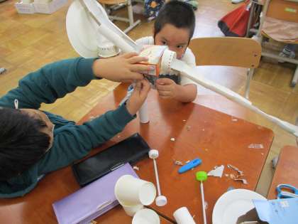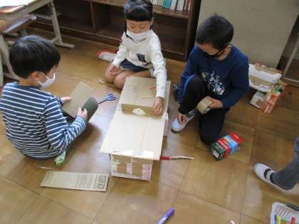 生活科の学習では,身近にあるものからいろいろな遊びを発想し,楽しんでいます。ペットボトルを並べてボウリングにしたり,楽器をつくったり,また風の力やゴムの力で動くおもちゃをつくったりと,遊びに使うものや遊び方を工夫して取り組んでいます。実際に遊んでみることで,「もっとこうしたほうがおもしろい」など分かってくることがあるようで,試行錯誤しながら楽しんでいます。活動するたびに新しい遊びのアイデアが出てくるあたり,さすが子どもたちは遊びの天才だなと感心します。
