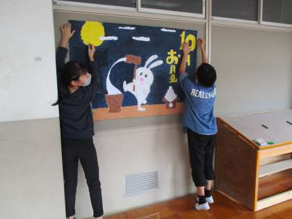 体育館に向かう廊下に掲示すると,さっそく着替えを終えた5年生の子どもたちが「ウサギがふわふわしていてかわいいなぁ」「おもち食べたいなぁ」など,話をしながら見ていました。