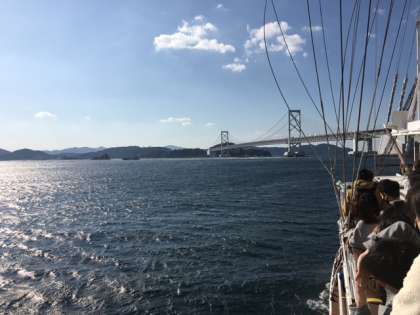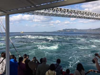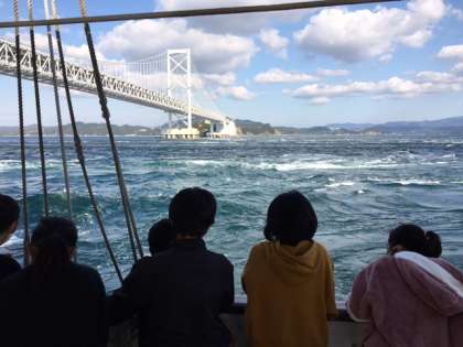 咸臨丸に乗船し、いざうずしおクルーズに。船から見える景色を楽しみながら、鳴門海峡へむかいました。今日は潮の条件も良かったようで、いくつかのうずを見ることができました。船が傾くほどの潮の流れの速さにびっくりです。