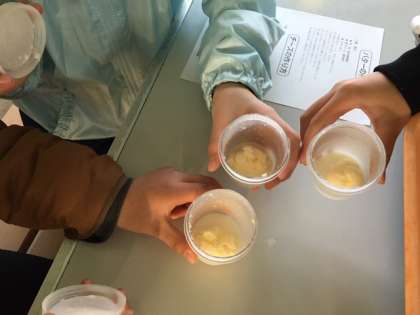 最後にバターづくり体験をしました。牛乳と生クリームを混ぜた容器をひたすらシェイクしました。すごく腕が疲れたけど、固まった時はとても嬉しそうでした。出来たてバターはクラッカーにつけてさっそく試食しました。とても美味しかったです。