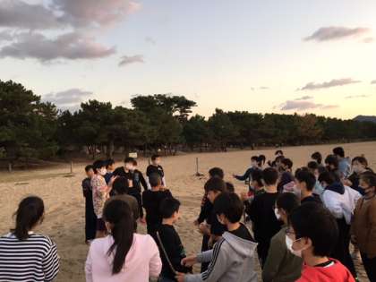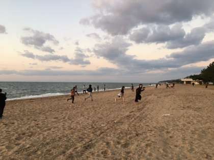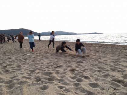 夕日を見た後は、サンセットタイムということで、みんなでレクレーションをしました。最初は鬼ごっこ。砂浜に足をとられながらも必死に走って鬼から逃げていました。その後は、ビーチフラッグをして楽しみました。白熱した試合が繰り広げられました。