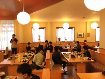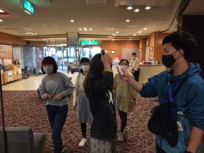 朝活の後は朝食です。レストランに入る前に検温をして、健康観察をしました。みんな元気です。