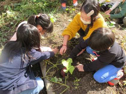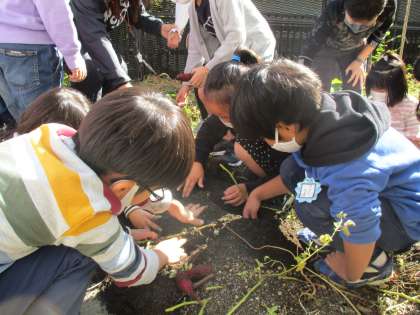 先週につる切りをしておいたさつまいもの収穫をしました。今回も1年生と2年生のなかよしペアのお友達で協力しておいもほりをしました。おいもを見つけると,まず2年生が周りの土を取り除いて,取りやすいようにしてから1年生に抜かせてあげました。2年生は去年自分たちがしてもらったように,1年生のことをよく考えて,やさしい気遣いをしてくれました。また1年生は,2年生の言うことをよく聞いて,楽しくおいもほりをすることができました。がんばって育てて収穫したさつまいも,どんな味がするのか楽しみです。