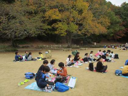 たくさん歩いた子どもたち。お昼ご飯を待ち遠しく思っていたようで,お昼の休憩場所に着いた時には大喜びしていました。みんなでおいしくお昼ご飯を食べました。