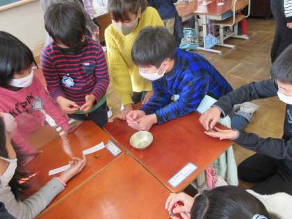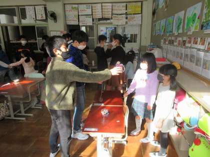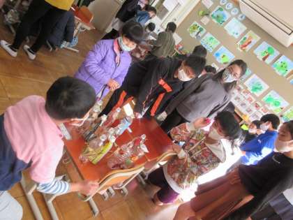 昼休みに日頃お世話になっている6年生を招待して,秋のたからものパーティーを行いました。自分のブースに来てもらおうと,エスコートをする1年生。6年生も1年生のペースに合わせて,楽しんでくれ,とても盛り上がった時間となりました。