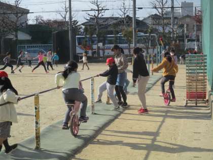今日のお昼休みもたくさんの子が一輪車を使って遊んでいたのですが,チャイムが鳴るときちんと元の場所に戻し,片付けることができていました。