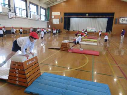 体育科の学習では,ふみこしとびやまたぎ乗りを繰り返し学習しています。その後,3段,4段,5段の段違いの跳び箱を両足で踏み切ることや,手を奥につくことを意識しながら取り組みました。跳べる段数が上がって,嬉しそうでした。