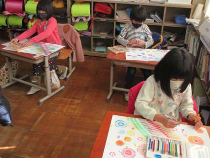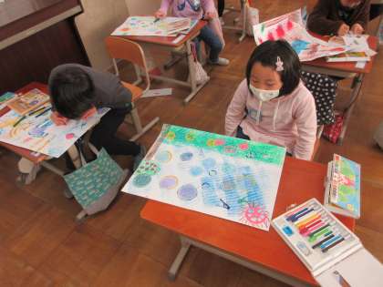 図工では,絵の具でローラーや型押しをした後,パスティックで色をつけたり,パスでせんをひいたりして,絵から想像した世界をあらわしました。クーピーの色を重ね,深みのある色の子,塗り方を工夫する子など,たくさんの頑張りが見られた2時間でした。