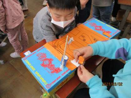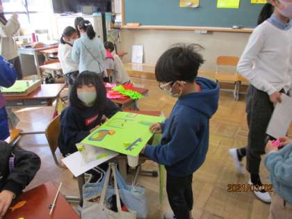 楽しみにしていたおもちゃ大会を開催しました。1校時は,1年生をゲストにまねき全員がおもちゃのお店を開きました。1年生に色々なおもちゃのお店を楽しんでもらってとてもうれしそうでした。