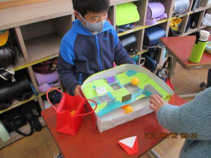 2校時は3年生1・2組交流しておもちゃ大会です。校長先生も飛び入りゲストできていただきました。クラスを行き来しながら遊びました。理科で学習した色々な仕組みがあって面白かったです。