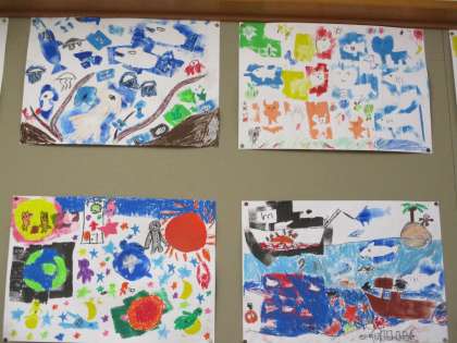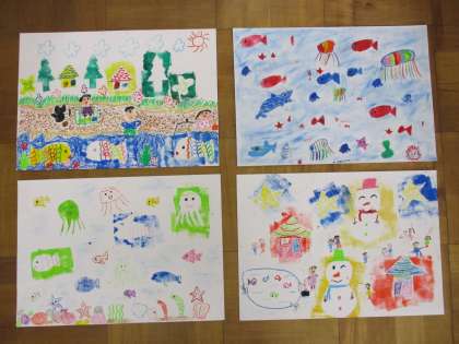 「たのしくうつして」の作品づくりでは,型紙を作って表し方を工夫しました。同じ形をたくさんうつすことで,にぎやかで楽しい作品になりました。