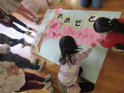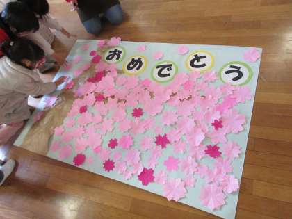 別れと出会いの季節が近づいてきています。今日は,卒業していく6年生にむけてのお祝いの気持ちを表す掲示を作りました。はじめておりがみで桜を作った子もたくさんいましたが,友達と教え合いながら作成し,みんなで貼っていきました。「ここに貼るといいよ。」とアドバイスしあっていました。