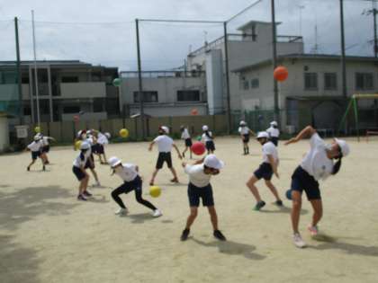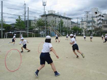 体育の学習では,体と心をリラックスさせ,友達と楽しく運動に取り組めるように,色々な体ほぐしの運動を行っています。ボールや棒,またフラフープなどを使った運動では,ペアやグループで協力して,楽しく運動に取り組んでいます。体を動かすことの面白さや気持ちよさに気付き,これからも積極的に運動に取り組んでいってほしいと思います。