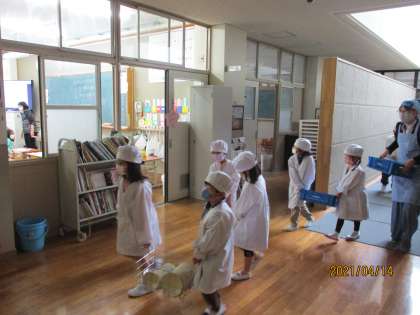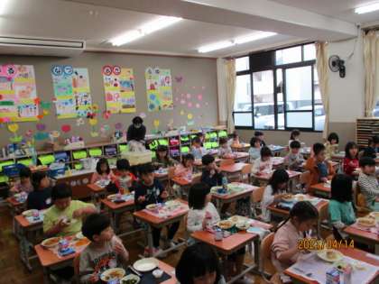 今日から給食が始まりました。全校の子どもたちが,給食が始まるのを楽しみに待っていました。1年生にとっては,小学校での初めての給食です。今日の献立は,小型コッペパン,牛乳,スパゲティのミートソース煮,ほうれん草のソテー,りんごゼリーでした。口の周りを赤くしながらも,おいしくいただきました