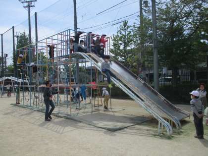 2年生は,体育科で遊具の使い方を学習したので,総合遊具の上まで登って遊べるようになり,滑り台も滑れることになりました。1年生の時はできなかったので,たくさんの子が遊んでいました。